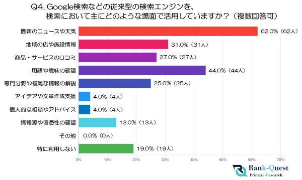 最も多かったのは「最新のニュースや天気」で62.0%(62人)、次いで「用語や意味の確認」が44.0%(44人)となりました。