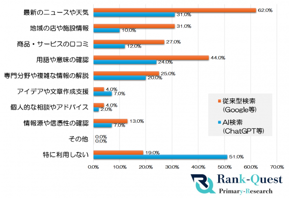 「最新のニュースや天気」では従来型検索が62.0%と圧倒的に高く、AI検索は31.0%にとどまりました。また「地域の店や施設情報」は従来型とAIで31.0%と10.0%、「商品・サービスの口コミ」も従来型27.0%に対しAIは12.0%と差が出ています。