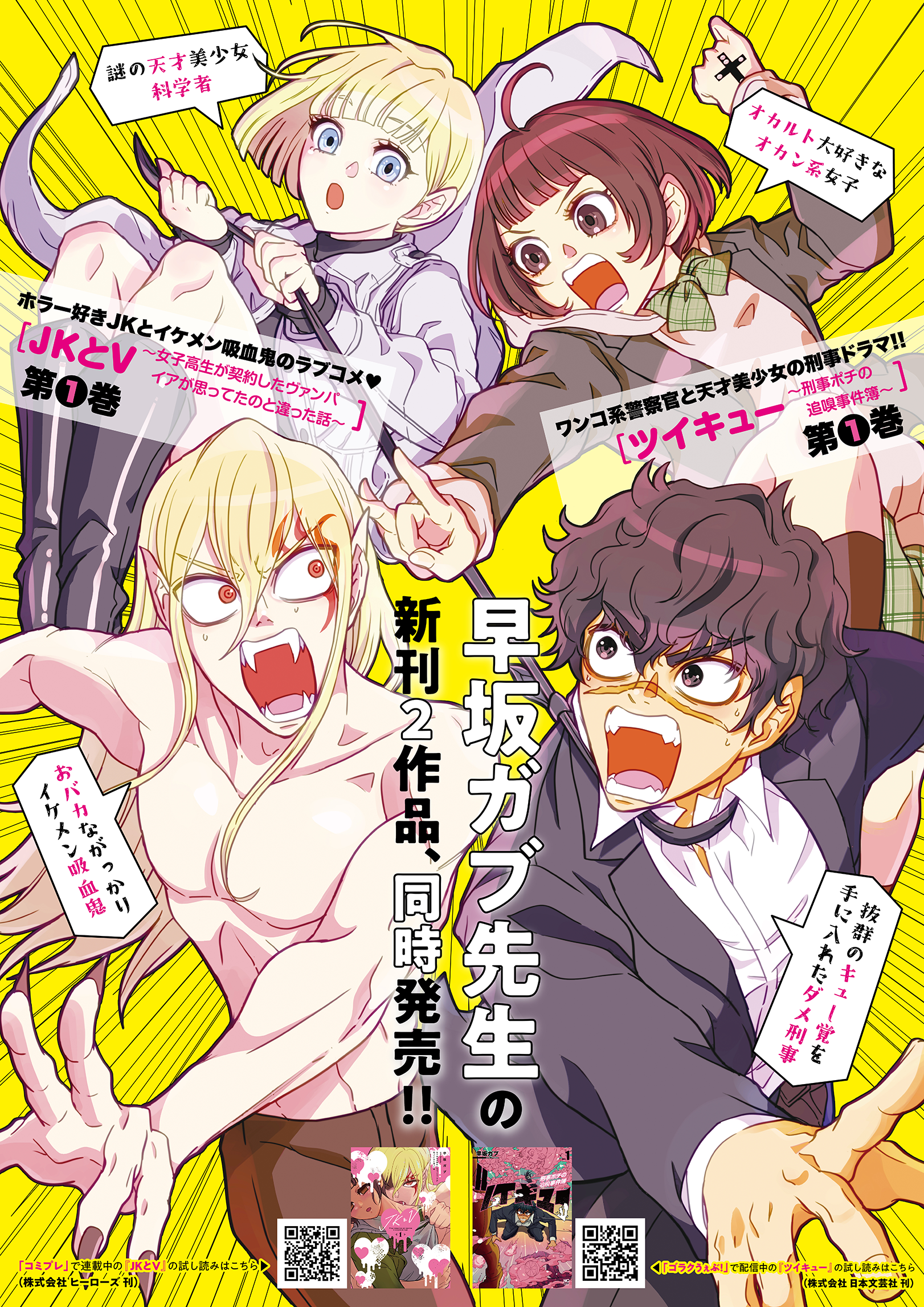 株式会社ヒーローズ(所在地:東京都千代田区、代表取締役:白井勝也)は、弊社が運営するマンガ配信サイト「コミプレ-Comiplex-」にて連載している『JKとV ~女子高生が契約したヴァンパイアが思ってたのと違った話~』1巻(著:早坂ガブ)を、2025年9月5日(金)に発売いたします。本書と『ツイキュー~刑事ポチの追嗅事件簿~』1巻(著:早坂ガブ/日本文芸社)の同時発売を記念し、2作品合同キャンペーンを開催いたします。