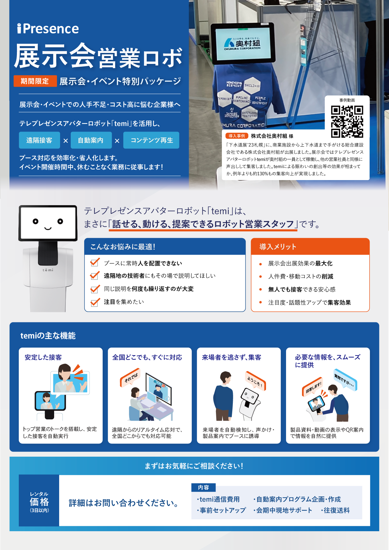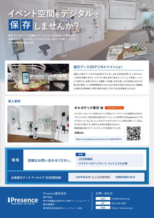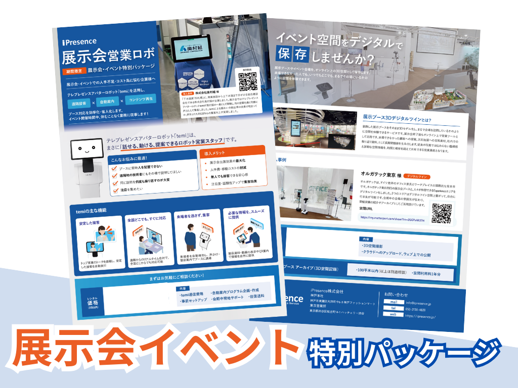 本パッケージは、テレプレゼンスアバターロボット(テレロボット)と高精細3Dデジタルツインで、展示会における集客と成果を最大化します。