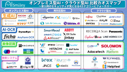 アイスマイリーは、AI導入における最新のAIサービス形態を整理した「オンプレミス型AI・クラウド型AI 比較カオスマップ」を、2025年9月16日に公開しました。掲載総数は63製品です。