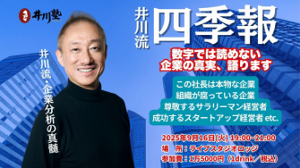 サイゾー株式会社が運営するトークライブシリーズ「井川塾」は、次回9月16日のテーマを発表しました。今回のテーマは『井川流・四季報 ~数字では読めない企業の真実~』です。