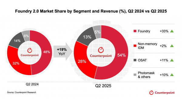 カウンターポイントリサーチのノード別ファウンドリー収益トラッカーによると、世界の半導体「ファウンドリー2.0」市場の収益は、2025年第2四半期に前年同期比19%増と大幅に増加しました。これは主に、先端プロセスと先端パッケージングの両方における堅調かつ持続的なAI需要と、中国の補助金プログラムによる需要の押し上げによるものです。この勢いはさらに加速し、2025年第3四半期にかけて前四半期比1桁台半ばの収益成長が見込まれます。