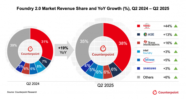 ・TSMCの市場シェアは、3nmプロセスの立ち上げとCoWoSの拡大により、2024年第2四半期の31%から2025年第2四半期には38%に上昇しました。