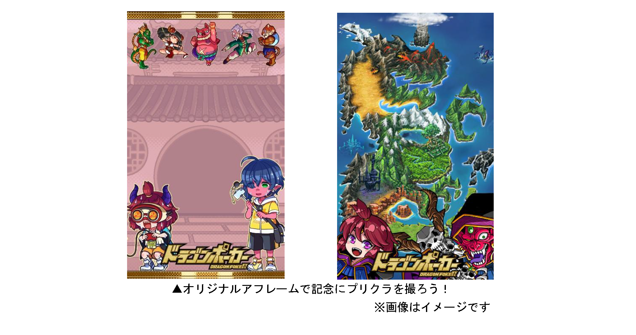 「スタンプラリーガチャ」のミッションを1つでもクリアすると、アソビズムブース限定のプリクラが撮影できます。『ドラゴンポーカー』からは9月19日(金)から開催中の特別記念スペシャルダンジョン「どらぽゲームショウ2025」などのフレームが登場!ミッションをクリアして、ドラポのキャラと記念に撮影しましよう!