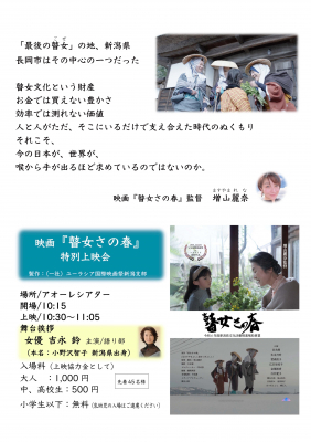 その中で、地元長岡市や新潟市、南魚沼市の瞽女唄保存に尽力されている方から、映画上映と瞽女唄保存会メンバーのコラボによるイベント開催も希望が続いている。9月23日は、長岡市アオーレシアターで10時15分から、映画「瞽女さの春」が上映される。