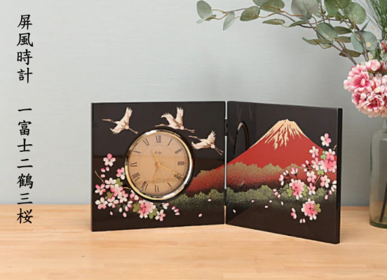 【紀州漆器×時計】漆芸木製屏風時計 一富士二鶴三桜