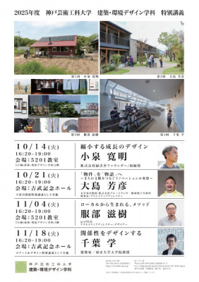 学校法人谷岡学園が運営する神戸芸術工科大学にて、2025年10月14日(火)、10月21日(火)、11月4日(火)、11月18日(火)の各日16:20より、建築・環境デザイン学科特別講義を開催します。