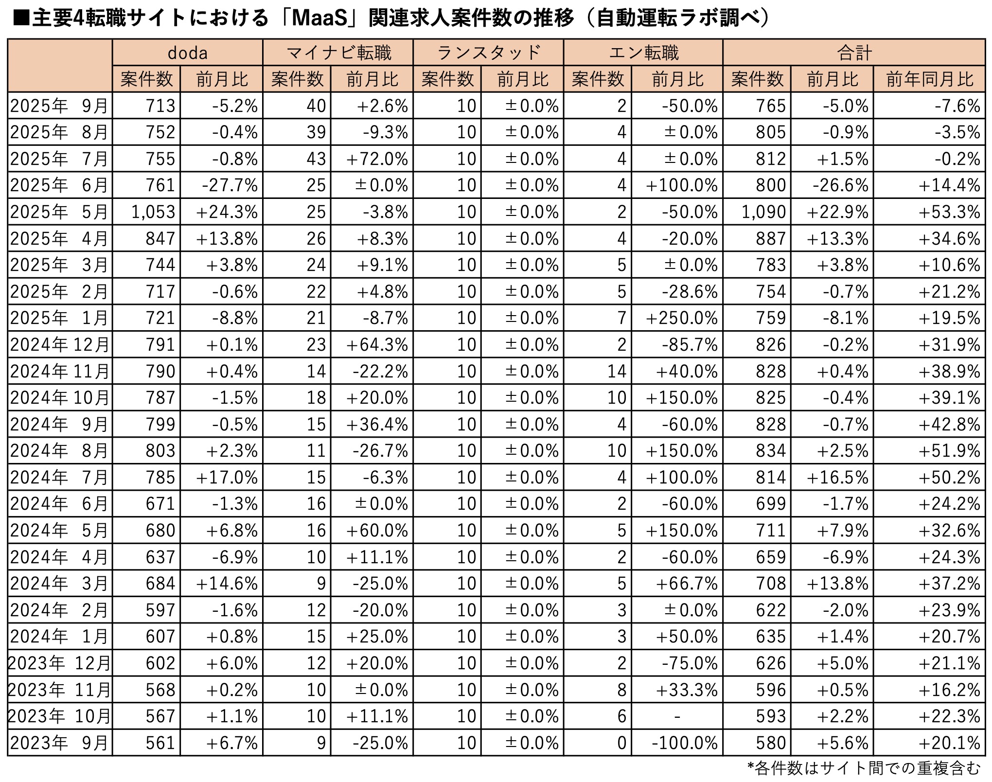 「MaaS」の関連求人案件数(主要転職4サイト)は2025年9月末時点で、前月比5.0%減、前年同月比7.6%減の765件となり、2カ月連続の件数減となりました。