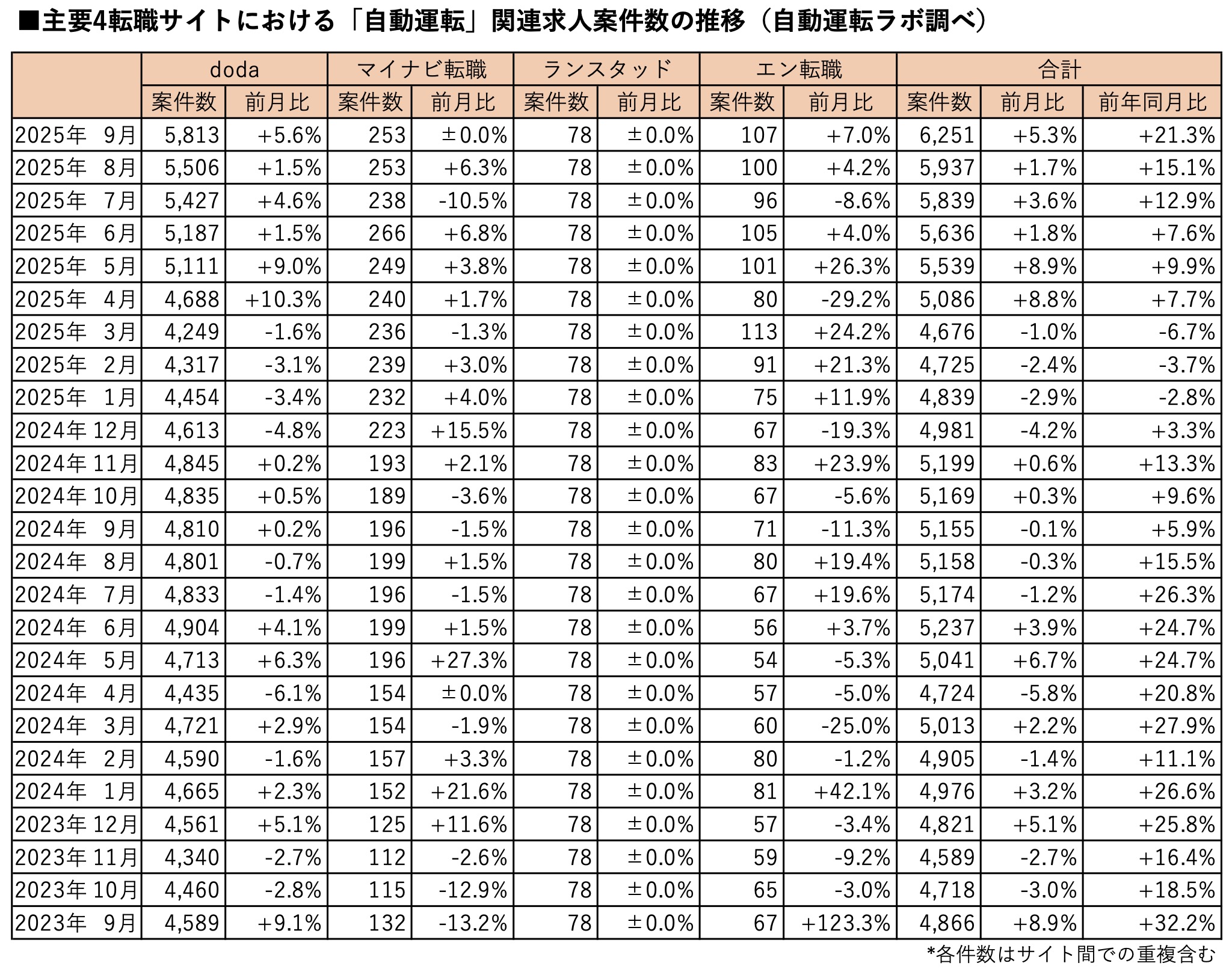 再び過去最高!自動運転求人、前月比5.3%増の6,251件