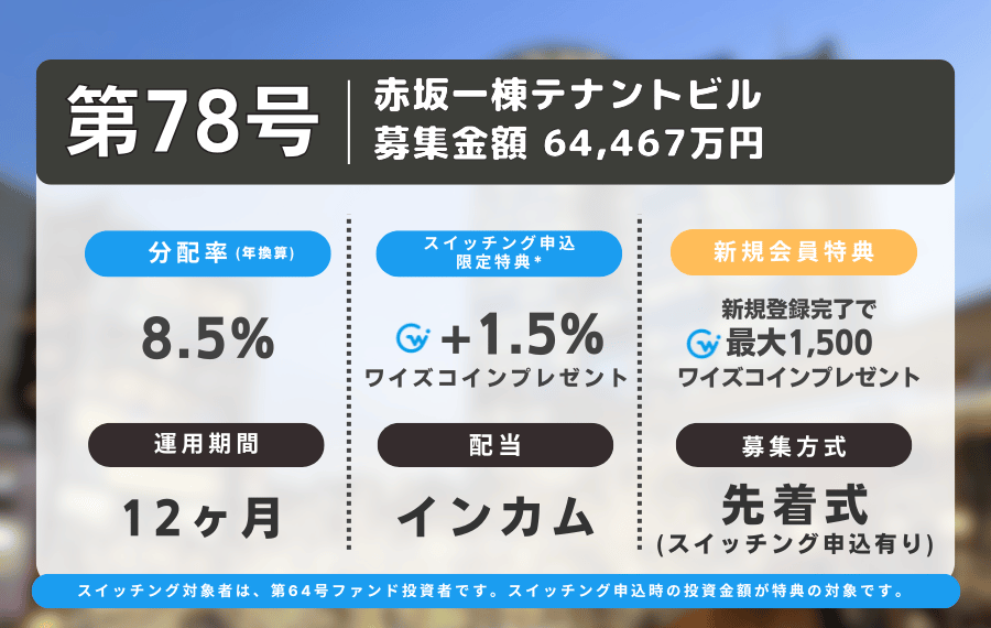 不動産クラウドファンディング「利回り不動産」を提供する株式会社ワイズホールディングス(本社:東京都港区、代表取締役:和泉隆弘)は、新たな投資案件「第78号ファンド(赤坂一棟テナントビル)」の募集を、2025年10月6日(月)18時より先着方式にて開始いたします。