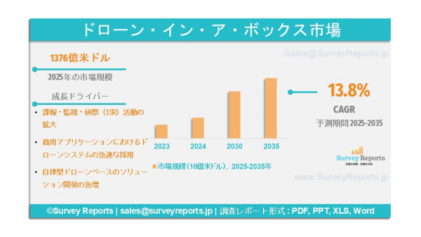 サーベイ・リポート社は、2025年10月に調査報告書を発表いたしました。ドローン・イン・ア・ボックス市場は、ソリューション別(ハードウェア、ソフトウェア)、タイプ別(シングルローター、マルチローター)、 用途別(測量・マッピング、検査、LiDAR、監視、熱画像、セキュリティ・緊急対応、その他)、最終用途産業別(防衛、建設、鉱業、石油・ガス、国土安全保障、医療サービス、輸送・物流、イベント管理、その他)に分類されています。- グローバル市場分析、動向、機会および予測、2025-2035年。本報告書はドローン・イン・ア・ボックス市場の予測評価を提供し、成長要因、市場機会、課題、脅威を含む主要な市場動向を明らかにしております。