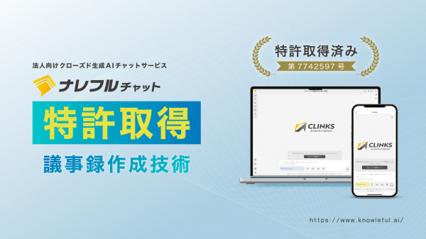 AIサービスやシステム開発を手掛けるCLINKS株式会社(本社:東京都中央区、代表取締役:河原浩介)は、会議音声・動画の高精度文字起こしと知識検索を可能にする「RAG対応型AI議事録生成システム」に関する特許(特許7742597)を2025年9月11日(木)に取得しました。