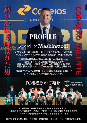ブラジル代表および浦和レッズで活躍し、現在は現職のブラジル国会議員としても活動しているワシントン氏がこのたびFC相模原ゼネラルマネージャー(GM)に就任いたしました。併せて、地域の人々に勇気と希望を届けるため、来日いたします。