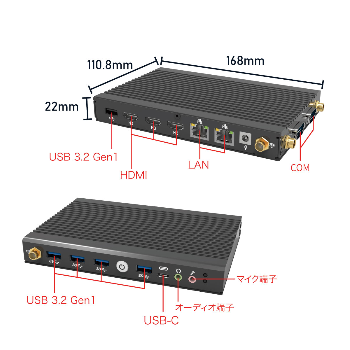 有線接続のLANポート2基に加えてUSB 3.2ポートを前後合わせて5基搭載し、レガシーデバイスとの接続に便利なCOMポート(RS232)も標準搭載しています。