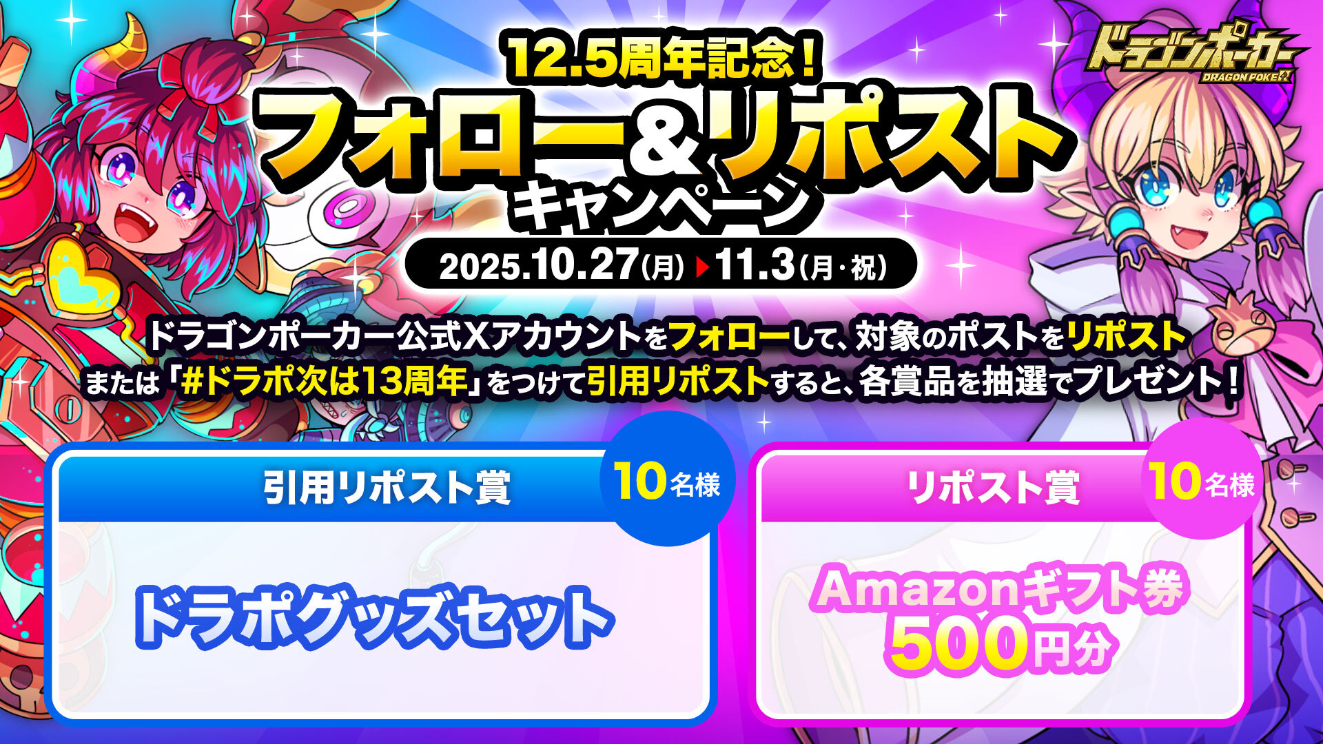 おかげさまで『ドラゴンポーカー』は、2025年5月に12周年を迎え、来年5月にサービス開始13周年を迎えます。それを記念し、「12.5周年記念!フォロー&リポストキャンペーン」を実施いたします。対象ポストをリポストまたはハッシュタグをつけて引用リポストいただいた方の中から抽選で豪華賞品をプレゼント!たくさんのご参加お待ちしています!