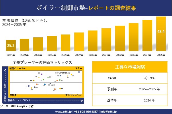 SDKI Analytics(本社:東京都渋谷区)は、このたび、2025年10月21に「ボイラー制御市場調査レポート:2025-2035年の市場規模、シェア、傾向の予測」を発表しました。ボイラー制御に関する市場調査レポートには、統計的および分析的アプローチを使用した予測評価が含まれています。この調査レポートでは、一次および二次調査方法を使用して分析された主要な業界洞察を通じて将来の傾向を理解できるようにすることで、主要な市場動向を読者に説明しています。