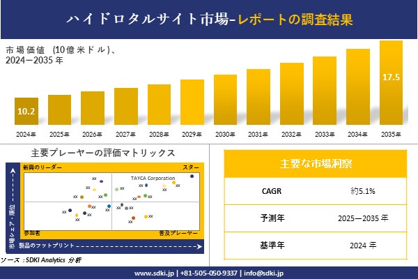 SDKI Analytics(本社:東京都渋谷区)は、このたび、2025年10月22に「ハイドロタルサイト市場調査レポート:2025-2035年の市場規模、シェア、傾向の予測」を発表しました。ハイドロタルサイトに関する市場調査レポートには、統計的及び分析的アプローチを使用した予測評価が含まれています。この調査レポートでは、一次及び二次調査方法を使用して分析された主要な業界洞察を通じて将来の傾向を理解できるようにすることで、主要な市場傾向を読者に説明しています。