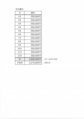 一カ月からの定期借家契約となります。月別賃料は下の表をご覧ください。パンフレットは平均の月額30万円を表示しております。1年以上の契約でしたら、年間計360万円のところを327万円で賃貸いたします。