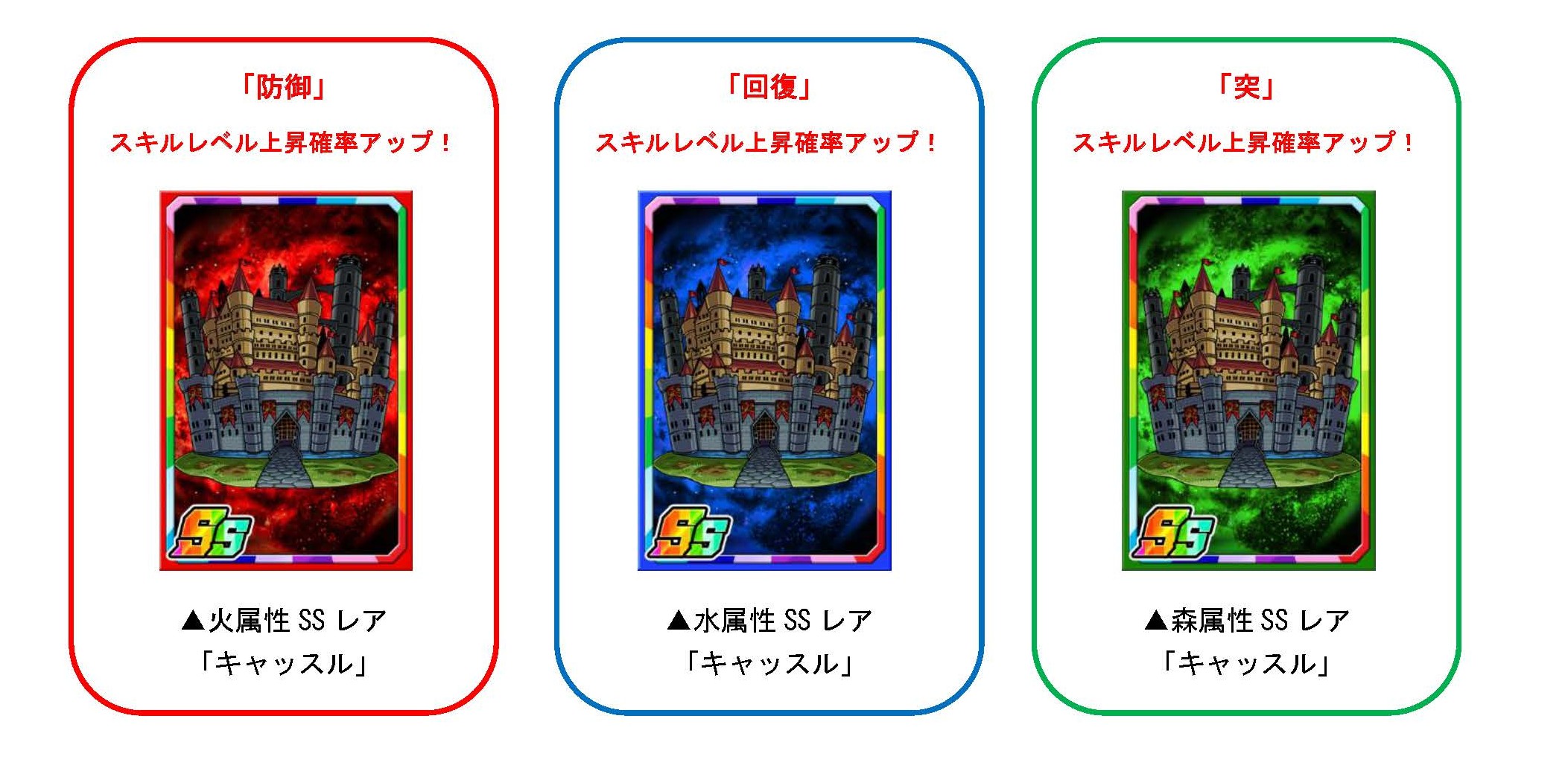 「円卓P」を使い素材ガチャを回すと、限定の強化素材「キャッスル」を手に入れることができます。一部のモンスターに使うと強化値2倍の効果があるほか、防御・回復・突のスキルレベル上昇確率もアップします。