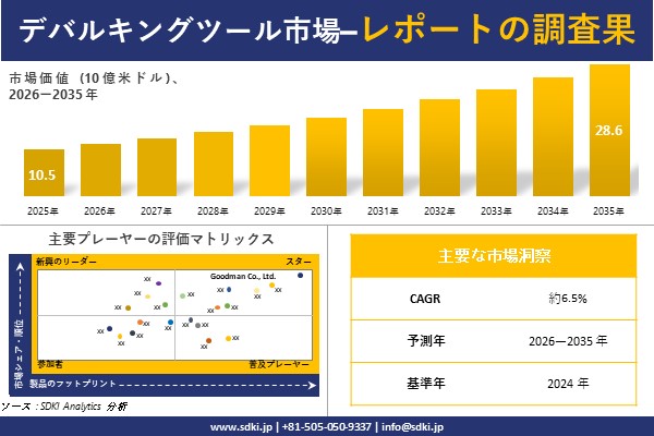 SDKI Analytics(本社:東京都渋谷区)は、このたび、2025年10月29に「デバルキングツール市場調査レポート:2026ー2035年の市場規模、シェア、傾向の予測」を発表しました。デバルキングツールに関する市場調査レポートには、統計的及び分析的アプローチを使用した予測評価が含まれています。この調査レポートでは、一次及び二次調査方法を使用して分析された主要な業界洞察を通じて将来の傾向を理解できるようにすることで、主要な市場傾向を読者に説明しています。