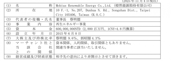 (1) Mobius Renewable Energy Co.,Ltd.(橙然能源股份有限公司)