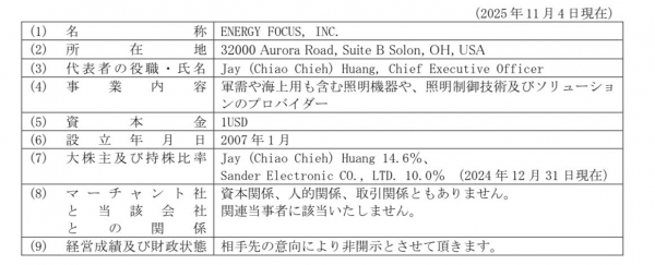 ENERGY FOCUS, INC.は、米NASDAQ 上場の、軍需や海上用も含む照明機器や、照明制御技術及びソリューションのプロバイダーで、本プロジェクトでは、出資を行うとともに、蓄電池周辺のシステム構築を担います。