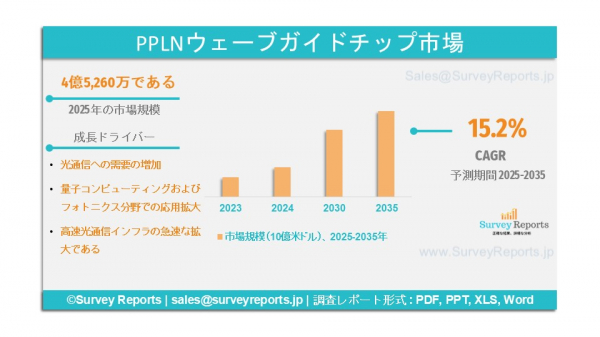 Survey Reports LLCは2025年11月に、PPLN(周期分極反転ニオブ酸リチウム)導波路チップ市場のタイプ別セグメンテーション(単一グレーティング、マルチグレーティング、ファンアウトグレーティング)、用途別セグメンテーション(通信、フォトニクス、量子光学、バイオ医療およびヘルスケア、その他)、エンドユーザー産業別セグメンテーション(通信サービスプロバイダー、研究機関・研究所、防衛・航空宇宙、ヘルスケア・バイオ医療機関、その他)-世界市場分析、トレンド、機会および2025~2035年の予測 に関する調査報告書を発表したと明らかにした。この報告書は、PPLN導波路チップ市場の予測評価を提供し、市場の成長要因、市場機会、課題、ならびに脅威といった主要な市場動態を明らかにしている。