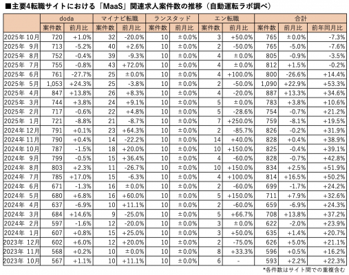 「MaaS」の関連求人案件数(主要転職4サイト)は2025年10月末時点で、前月からは横ばい、前年同月比7.3%減の765件となりました。