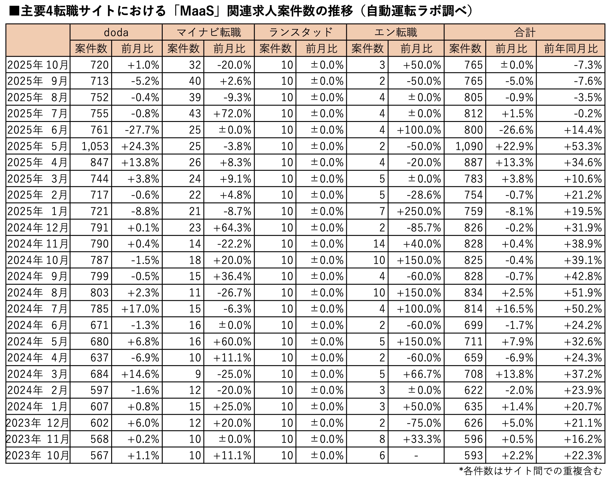 主要転職サイト別では、dodaが前月比1.0%増の720件、マイナビ転職は同20.0%減の32件、ランスタッドは前月と変わらず10件、エン転職は同50.0%増の3件でした。