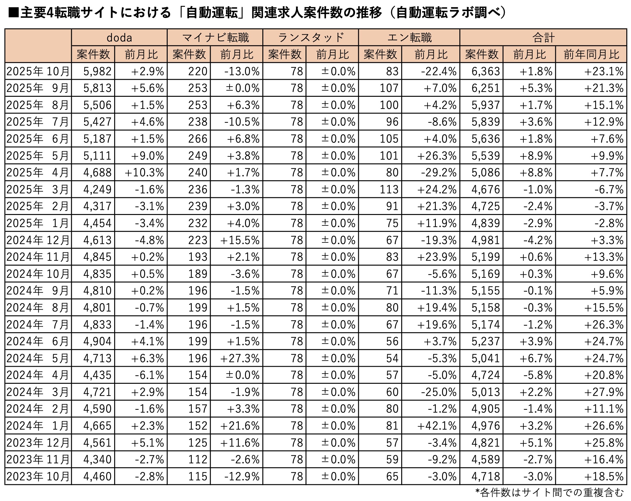 サイト別では、dodaが前月比2.9%増の5,982件、マイナビ転職は同13.0%増の220件、ランスタッドは前月と変わらず78件、エン転職は同22.4%減の83件でした。