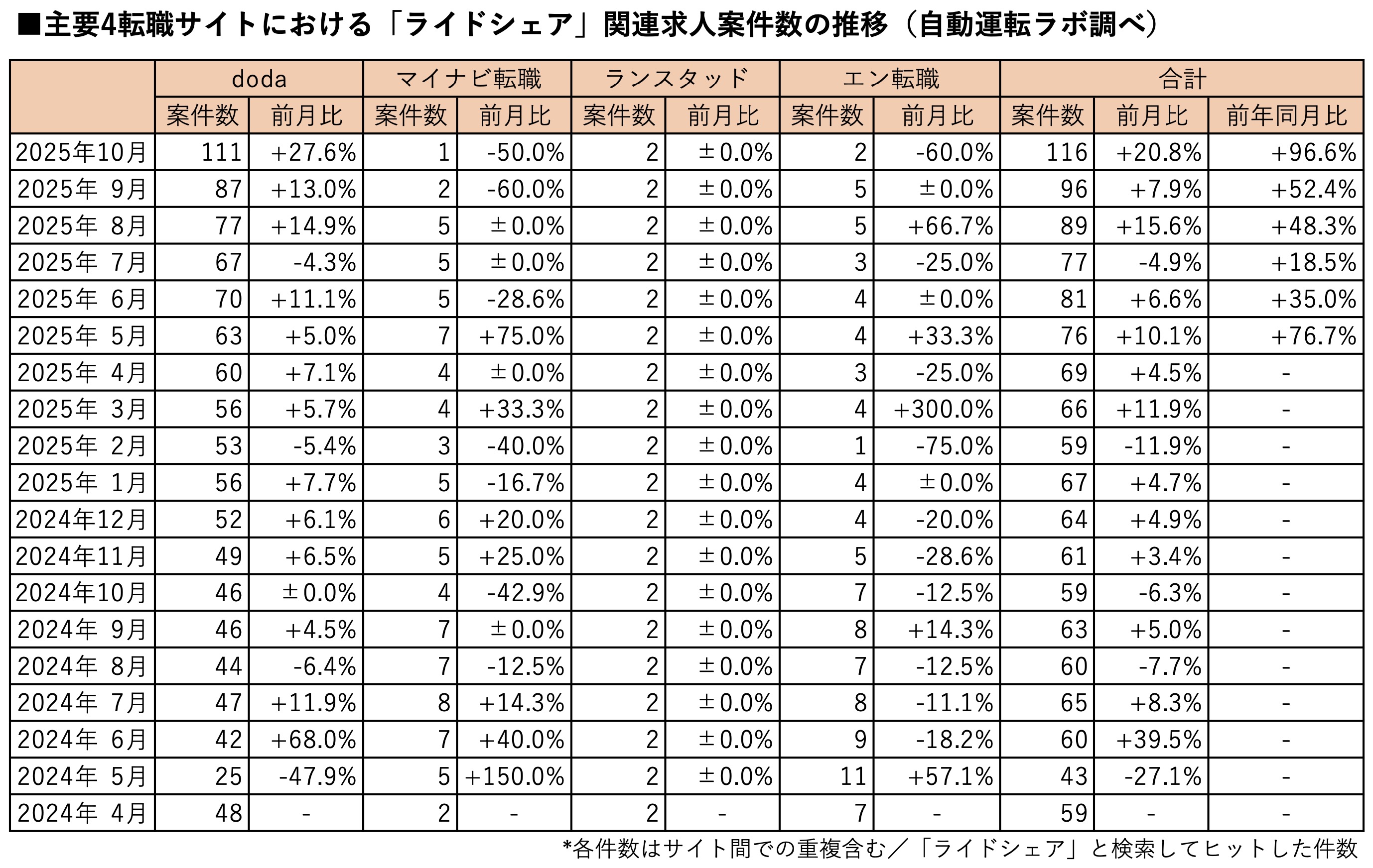 ライドシェア求人、自動車メーカーの案件も!2025年10月は過去最高の伸び