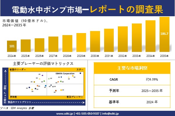 SDKI Analytics(本社:東京都渋谷区)は、このたび、2025年11月03に「電動水中ポンプ市場調査レポート:2025-2035年の市場規模、シェア、傾向の予測」を発表しました。電動水中ポンプに関する市場調査レポートには、統計的および分析的アプローチを使用した予測評価が含まれています。この調査レポートでは、一次および二次調査方法を使用して分析された主要な業界洞察を通じて将来の傾向を理解できるようにすることで、主要な市場動向を読者に説明しています。
