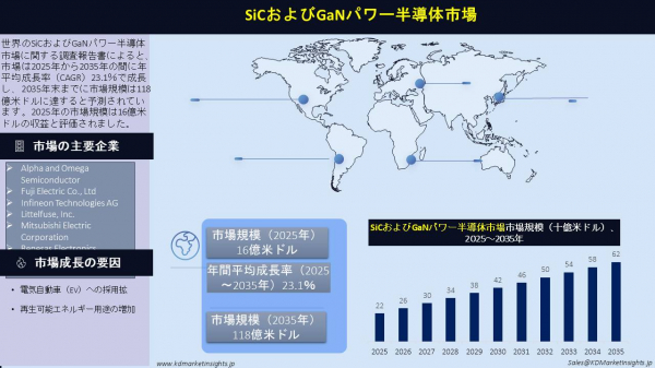 KDマーケット・インサイツは、「SiCおよびGaNパワー半導体市場の将来動向と機会分析―2025年から2035年」を題した市場調査レポートを発表しました。本レポートの範囲には、現在の市場動向および将来の成長機会に関する情報が含まれており、読者が的確なビジネス判断を下すための資料となります。本調査では、KDマーケット・インサイツの研究チームが一次および二次分析手法を用いて市場競争を評価し、競合他社をベンチマークし、Go-to-Market(GTM)戦略を分析しました。