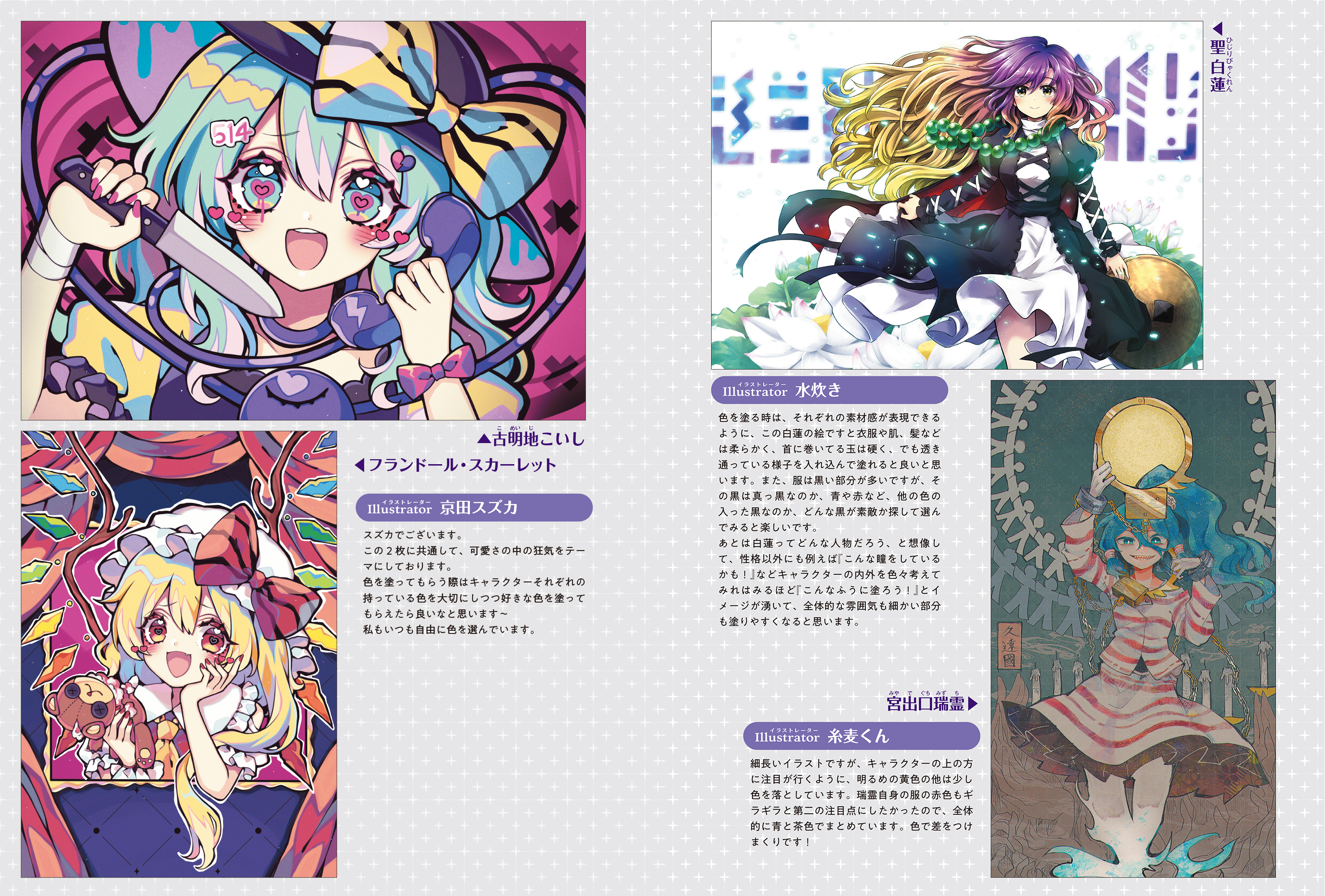 東方イラストで著名な「粗茶」、「ゆっくり霊夢」、「ゆっくり魔理沙」で有名な「まそ」など20名以上の東方絵師が参加。おなじみの大人気キャラから新規キャラまで、全31種類で贈るバラエティ豊かな塗り絵本です。