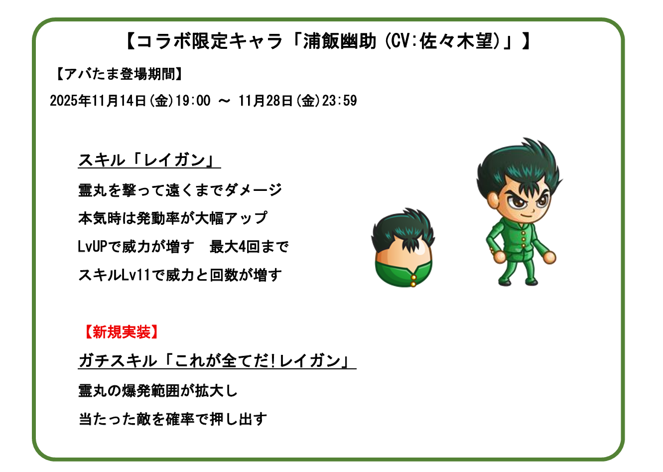※その他の「幽遊白書のアバたま」に関する詳細はゲーム内お知らせに記載されておりますので、必ずご確認ください