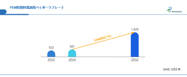 LP Informationの調査レポート「世界PEM形燃料電池用バイポーラプレート市場の成長予測2026~2032」(https://www.lpinformation.jp/reports/594194/bipolar-plates-for-pem-fuel-cells)によると、2025~2031年のグローバル市場は年平均成長率22.1%(CAGR)、2031年には19.25億米ドル規模に達すると予測されている。この高成長見通しは、自動車(FCV)・定置型発電・家庭用コジェネレーションなど複数用途が市場を牽引する構造に起因する。燃料電池スタックの標準化と量産体制の整備に伴い、下流市場拡充と並行してバイポーラプレート需要が急伸する。この部材の採用が、水素・燃料電池社会の構築にどう影響するかは、市場構造の変化を読み解く重要な指標となる。