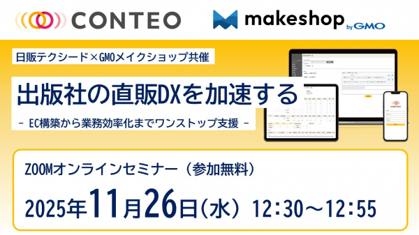 日販テクシード株式会社(本社:東京都中央区、代表取締役社長:藤澤 徹、以下 日販テクシード)は、GMOメイクショップ株式会社(本社:東京都渋谷区、代表取締役社長:向畑 憲良、以下 GMOメイクショップ)と共同で、出版社の直販ビジネス(D2C・BtoB)におけるDX推進を支援するオンラインセミナーを2025年11月26日(水)に開催いたします。