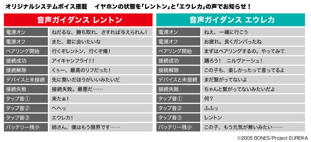 音声ガイダンスは「レントン・サーストン (CV:三瓶由布子)」、「エウレカ(CV:名塚佳織)」の録り下ろしボイスを搭載。電源オンやオフ、ペアリング時やタップ音等、各モデル全11ワードの豪華内容となっております。