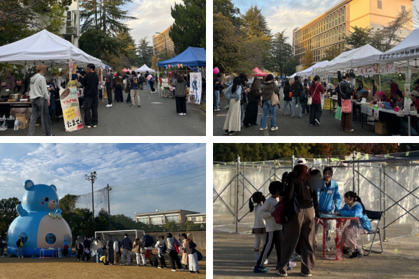 模擬店は14団体が出店。ステージでは協賛社や学生サークルなどが出演して、会場を沸かせました。お笑いライブではサンシャイン池崎、金の国が登場。学生や近隣住民はもちろん、家族連れらが皆で笑顔を広げました。