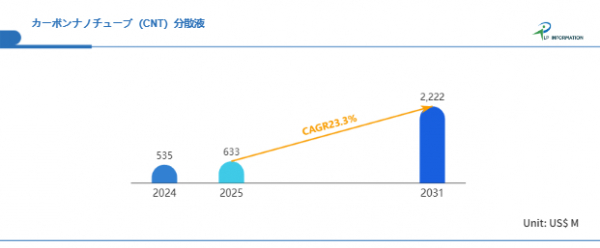 LP Information調査チームの最新レポートである「世界カーボンナノチューブ(CNT)分散液市場の成長予測2025~2031」(https://www.lpinformation.jp/reports/422178/carbon-nanotube--cnt--dispersions)によると、2025年から2031年の予測期間中のCAGRが23.3%で、2031年までにグローバルカーボンナノチューブ(CNT)分散液市場規模は22.2億米ドルに達すると予測されている。