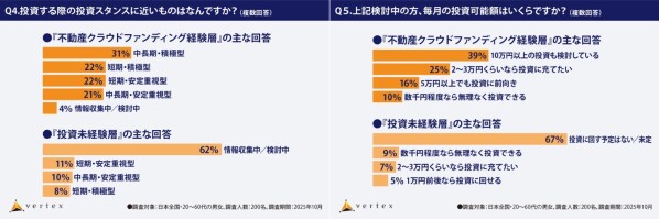 一方、不動産クラウドファンディング経験層の投資スタンスは「中長期的かつ積極型」が31%と最も多く、投資可能額についても月に10万円以上の投資を検討しているとの回答が39%に達しています。