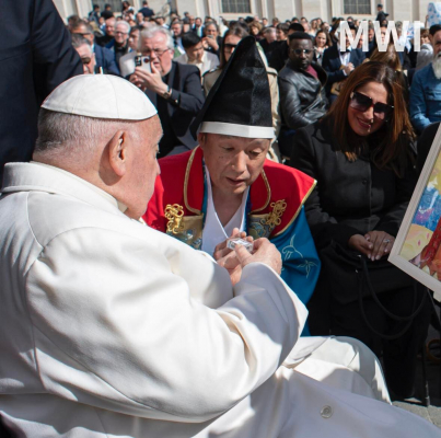 写真 フランシスコ前ローマ教皇に謁見。樽谷大助よりサダコの折り鶴シリアルNo2刻印レプリカ寄贈