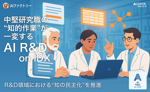 企業データとAIの利活用カンパニー、AIデータ株式会社(本社:東京都港区、代表取締役社長 佐々木隆仁、以下AIデータ社)は、研究開発部門の業務効率化と知識再利用を実現するAIナレッジ統合プラットフォーム「AI R&D on IDX」を、グループ企業リーガルテック株式会社と連携し、R&D領域における研究開発の高速化、過去の知見形式知化を実現するインフラとして、本格推進を発表しました。