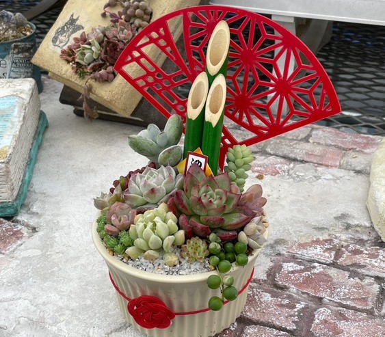 ・多肉植物を使った正月仕様の寄せ植え制作