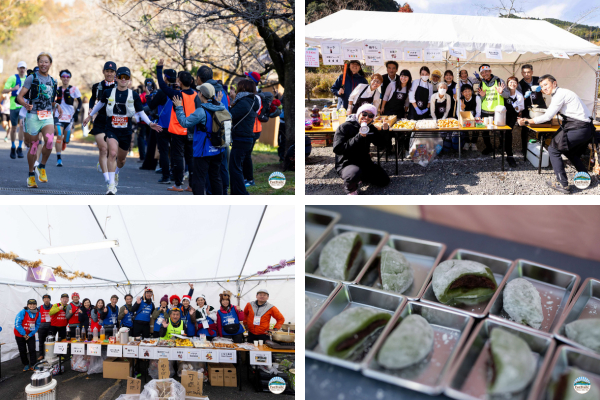 昨年新設された100マイルは、制限時間が100kmと同じ32時間という非常に厳しい時間設定。完走を目指すランナーは昼夜を問わずに体を動かし続け、一休みする時間も気を抜けません。選手の皆さんに次の一歩を踏み出していただけるように、明日香野は「5+1個増量 よもぎあんこ餅」「5+1個増量 豆あんこ餅」「5+1個増量 塩あんこ餅」「和sweets ぷち大福」をお届けして応援しました。