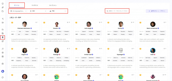 声のタイプ、用途、人気順などで音声を検索でき、ワンクリックで試聴が可能です。目的に合った音声を効率よく探すことができます。