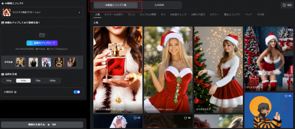 AI動画エフェクトは、画像をアップロードするだけで、カメラワークや光・粒子表現などの演出を自動で加え、クリスマス向けの動画を生成する機能です。テンプレート化された演出を選ぶだけで、短時間で目的に合った動画制作ができます。さらに、AI画像生成やBGM・ナレーション生成と連携することで、映像から音声までワンストップで仕上げることが可能です。