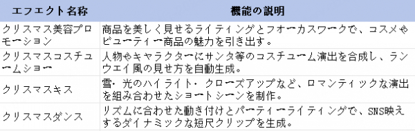 動画・音楽・音声関連のオンラインAIツールを提供するCleverguard Technology Co., Limited(所在地:香港九龍尖沙咀サリスベリーロード3号 スターハウス、代表取締役社長:黄徳安)は、2025年12月16日より、TopMediaiの新機能「AI動画エフェクト」の提供を開始しました。これにより、ユーザーはクリスマスに特化した演出を簡単にワンクリックで動画に加え、個人や企業など幅広い層が季節感あふれるコンテンツを手軽に制作できます。