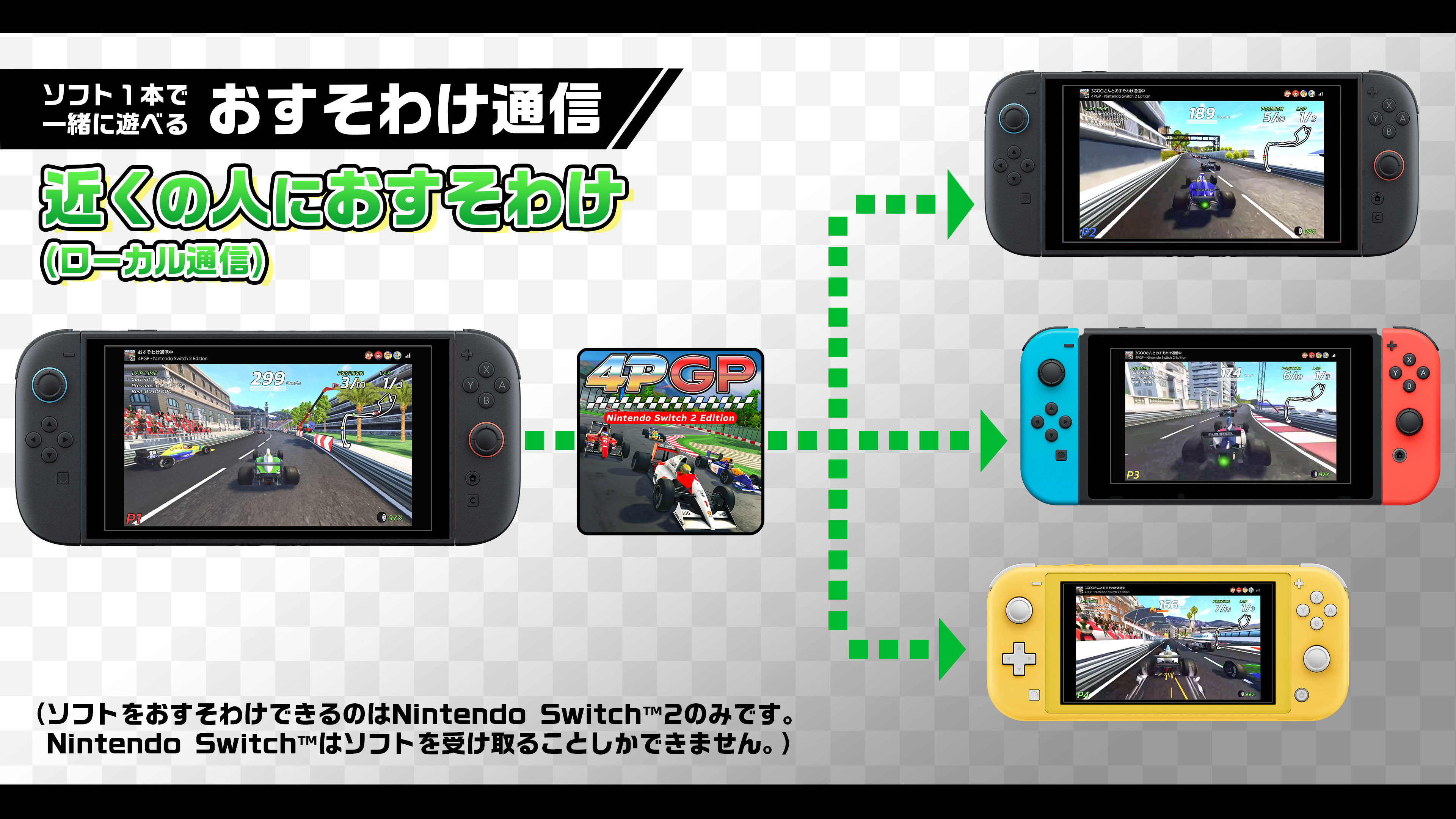 『4PGP - Nintendo Switch 2 Edition』は、おすそわけ通信を使ってソフト一本で友達と一緒に遊べます。